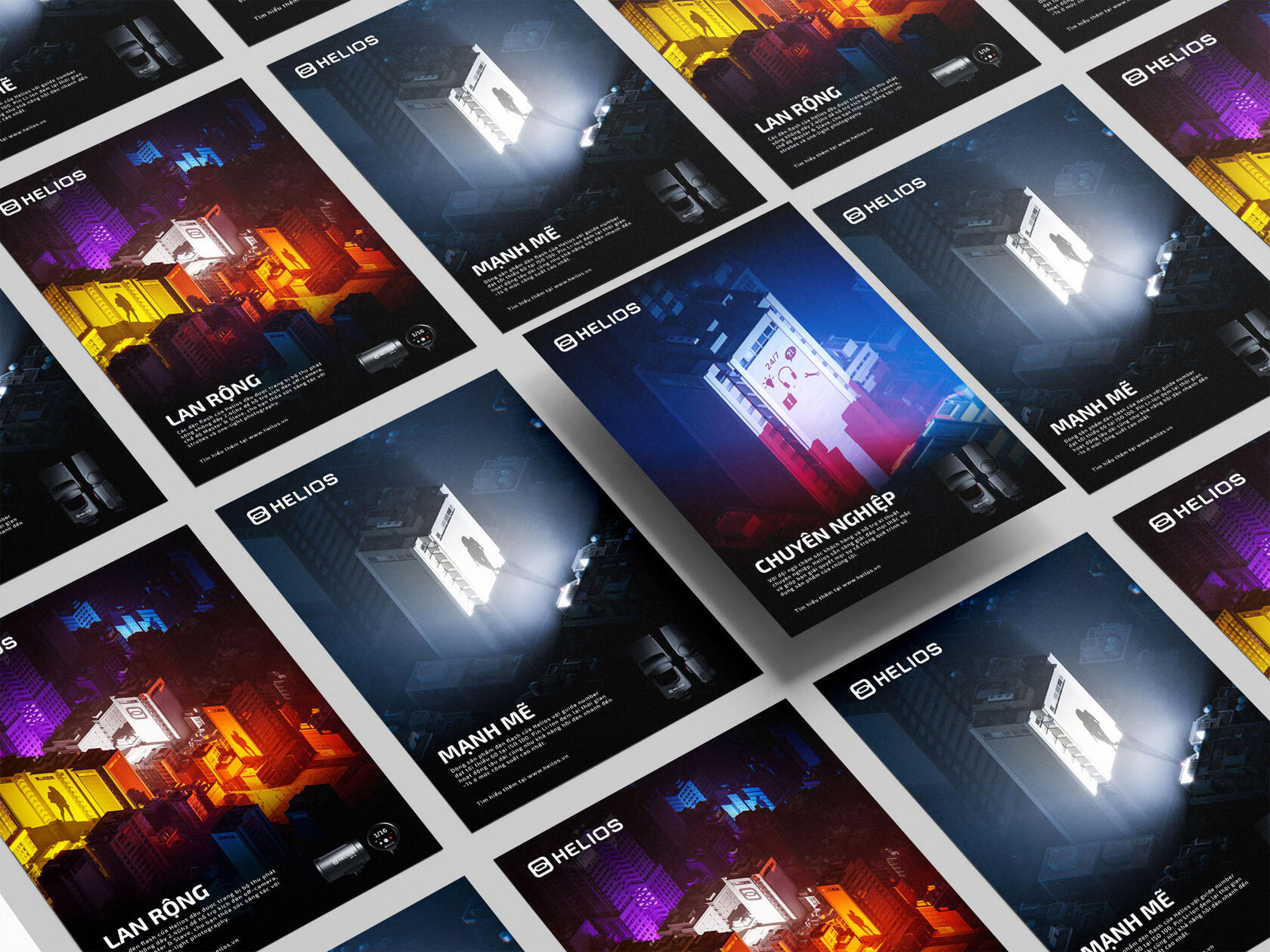 Lighting naturally takes centre stage for Helios, a company specialising in photographic lighting equipment. Based on the core principle of photography – “painting with lights” – the print ads employed dramatic light and shadow alongside intense, energetic colours. This concept was chosen for its strong resonance with photographers.
